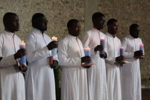 In the evening the solemn Mass of the Holy Spirit was presided over by Fr John Larsen, assisted by Fr John Hannan and Fr John Harhager. The liturgy of the Eucharist included an opening liturgy for the General Chapter where each candidate was called individually by name and presented a candle. The Superior General formally constituted the Chapter. There were universal prayers in seven different languages and each Major Superior presented a symbol of his Unit with a brief